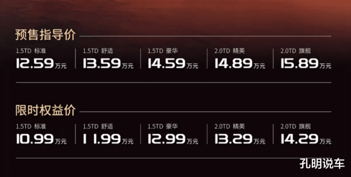 这款车预售起步价格达到12.59万,顶配旗舰版车型预售价15.89万。这个价格区间放在中型suv圈子里也确实不算贵,但毕竟还是传统燃油的架构,肯定还要拿出更多的价格诚意。所以发布会上还给出了所谓的限时权益价格,实际就相当于一口价的模式把入门标准版做到了10.99万。